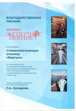 Профильный журнал «Экспертное мнение» выразил благодарность клинике "Виртуоз" за медицинский вклад и сотрудничество в 2024 году.