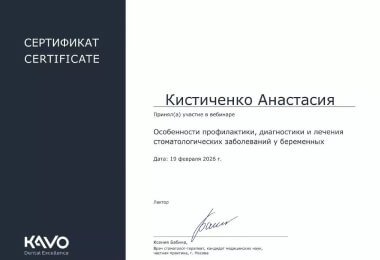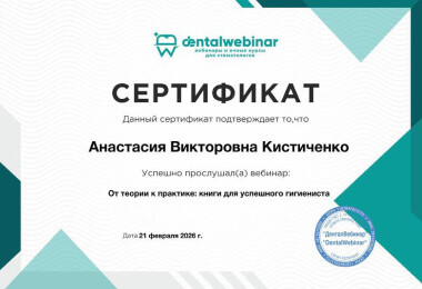 Прошла курс повышения квалификации в Стоматологическом колледже №1, г. Москва, с присвоением квалификации «гигиенист стоматологический» по специальности «стоматология профилактическая».