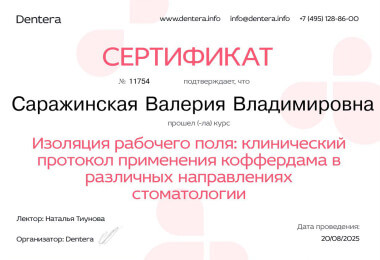 Окончила Воронежский государственный медицинский университет им. Н.Н. Бурденко. Имеет квалификацию «врач-стоматолог» по специальности «стоматология». Сертифицированный доктор в терапевтической стоматологии.